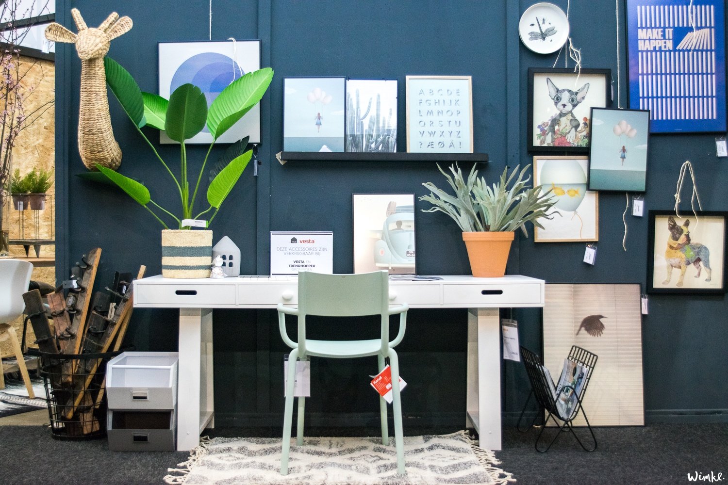 Ik werd erg blij van de stand van Vesta Meubelen. Hij was niet te missen, omdat het één van de grootste stands op de beurs was. Prachtig vond ik de stoere kinderkamers, de gestylde eetkamers en de accessoires die je kon shoppen. Mijn oog viel op de nieuwe Hay spijlenstoelen. Prachtig, eentje voor op de wensenlijst. Een stand die een stuk kleiner (maar zeker niet minder mooi) was was die van Boer Staphorst. In de warme roze met gouden woonkamer zag ik de prachtige kunstwerkjes van Tiny Stories voorbij komen. De afgelopen weken kom ik ze vaker tegen, op Instagram, in de magazines en Pinterest). Bij Boer Staphorst zag ik de kunstwerkjes weer en nu kon ik ze in het echt bekijken. Ik ben gezwicht en heb inmiddels een exemplaar van Tiny in huis.