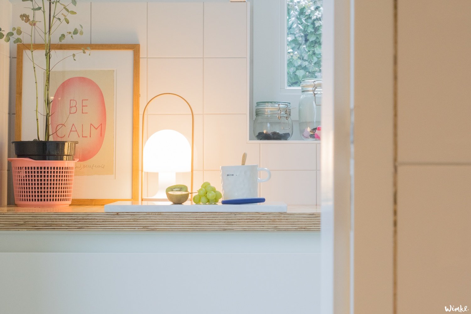 In het plafond hebben we spotjes. Geen dimbare spotjes, wel lekker werkbaar licht. Die spotjes hoeven niet aan als we niet in de bijkeuken hoeven te zijn. Toch miste ik een lichtpunt welke gerust de hele avond aan kan laten staan omdat er een glazen deur van de keuken naar de bijkeuken zit (bekijk de foto op Instagram). Voor MisterDesign mocht ik een blog schrijven over deze prachtige Follow Me tafellamp van Marset, ontworpen door Inma Bermudèz. Een stijlvol lampje met een blank houten hengsel met een Scandinavisch uiterlijk, welke weer perfect past bij het werkblad en je makkelijk meeneemt. Het lampje is dimbaar in drie lichtstanden. Wat helemaal handig is dat je de batterij van de lamp oplaadt via de USB poort en heeft een maximum aan 20 branduren!