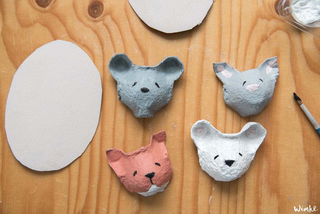 Verf je dieren in een basiskleur. En laat ze goed drogen. Misschien moet je nog een laagje verf aanbrengen. Wanneer de verf goed droog ik kun je met zacht roze verf de binnenkant van de oortjes verven of met zwart de oogjes en neusje. Voor meer precisie kun je ook altijd een markeerstift gebruiken.