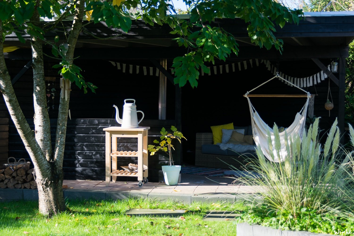 Na de eerste dag zat de eerste laag zwarte beits erop. De volgende dag nog een keer licht opschuren en een tweede laag erop. En kijk eens wat een gaaf resultaat! Tegen de zwarte wand komen de spulletjes veel mooier uit. Zo’n klus waarvan je denkt, waarom hebben we dit niet eerder gedaan? De hangstoel moest nog een plekje krijgen in de veranda. Ik kocht deze week mijn eerste boormachine. De hangstoel ophangen is het eerste geslaagde project. Er ging een spoedcursus boren aan vooraf en ik ben trots! Op naar vele volgende boorprojecten èn warme zomeravonden om nog lang van de zwarte veranda te genieten.