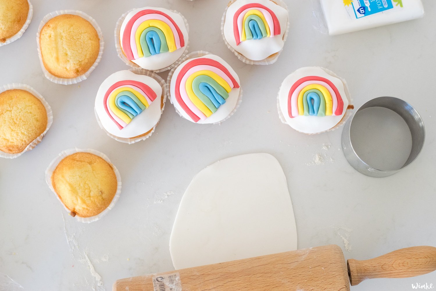 Madee wilde trakteren op cupcakes, een wens die al in augustus een paar keer voorbij kwam. Het liefst met een flinke klodder botercreme, glitterparels en andere dingetjes waar tanden en kiezen heel gemakkelijk op breken. Gelukkig was ze meteen om toen ik voorstelde om regenboogjes op de cupcakes te plakken, gewoon platte zonder wolkje. Met de regenboog cupcakes trokken we het thema van het eenhoornfeest lekker door. Donderdagmiddag begon ik met de klus. Uit voorzorg voor het mislukken van de cupcakes, haalde ik kant en klare uit de supermarkt (tssssss).