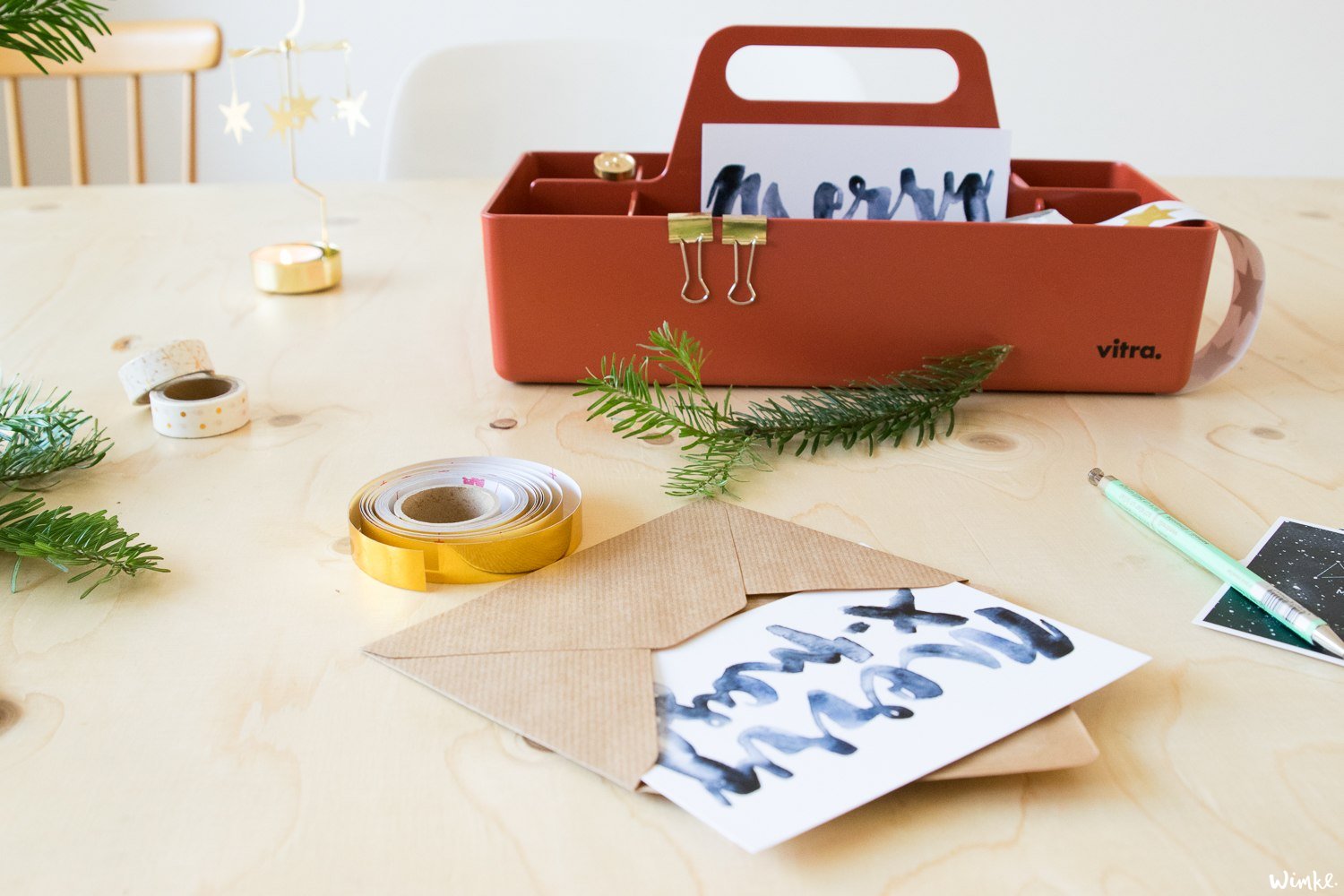Een poosje geleden vroeg MisterDesign of ik met ze wilde samenwerken. Maar natuurlijk! Ik smul van de spullen op hun website, dus zo’n samenwerking moet wel goed komen. De Storage Toolbox, ontworpen door Arik Levy voor Vitra, stond al even op mijn lijstje en wist nu waar ik hem voor wilde gaan gebruiken. De Toolbox is perfect om al mijn kerstkaart-materiaal netjes bij de hand te houden. Plakbandjes, knijpers, schaar, gouden sterren stickers, postzegels, een pen en de kaarten hebben allemaal een eigen vakje. Ideaal en lekker stevig ook! En om de styling helemaal af te maken knipte ik een paar dennentakjes van de kerstboom. De kleur van de Toolbox is steenrood, dé nieuwe kleur ons interieur samen met het blank hout, zacht roze en wit. Ik kan hem dus gewoon op de kast laten staan, als woonaccessoire.