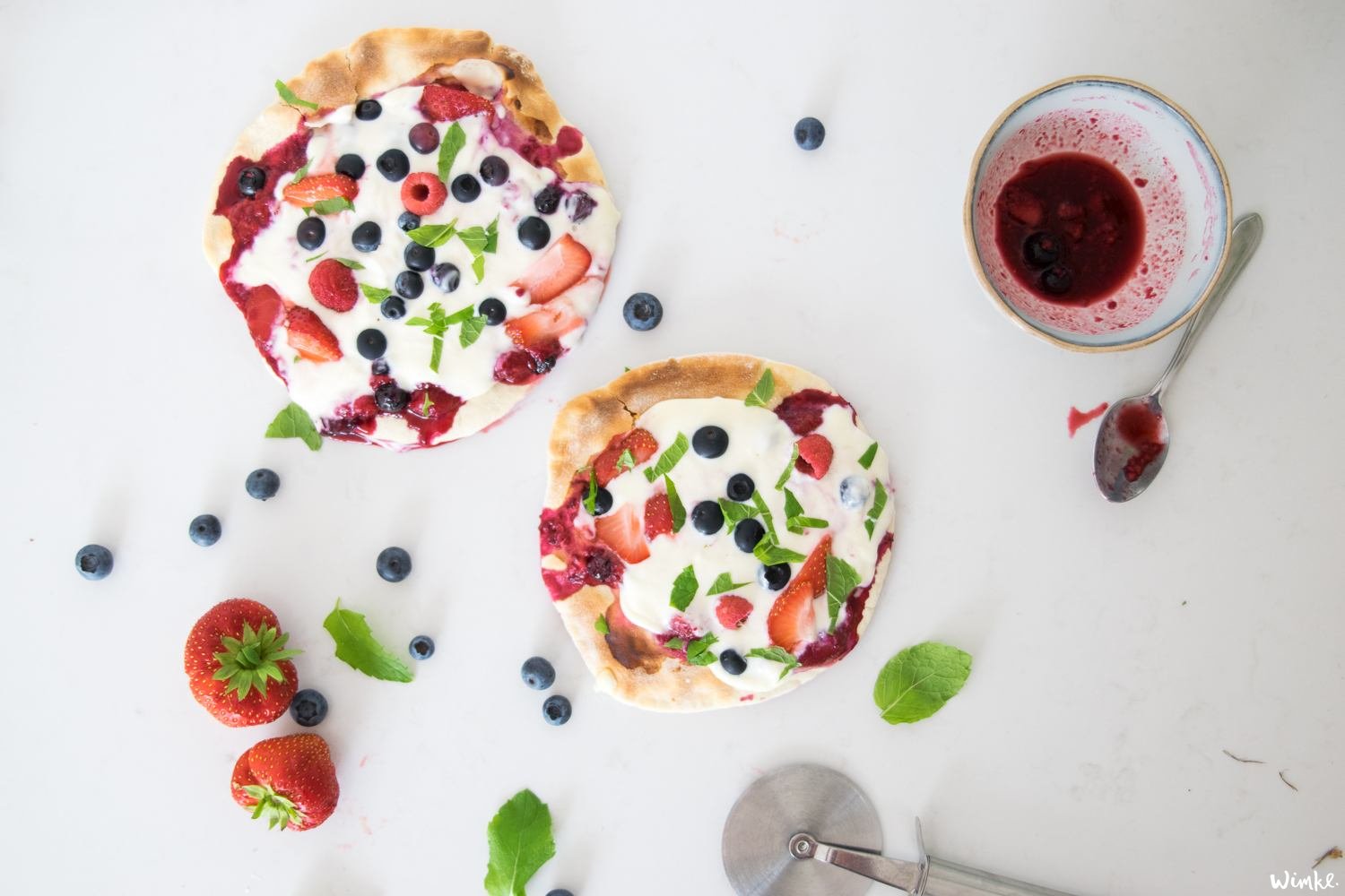 Maak het pizzadeeg. Ik gebruike een half pak pizzameel waar ik alleen water en olijfolie aan toe hoefde te voegen. Je maakt een bol deeg van ongeveer 250 gram. Dit kneed je en verdeel je in vier gelijke bollen. Rol het deeg uit met een deegroller. Leg de vier pizzabodems op de bakplaat en prik met een vork gaatjes in het deeg, anders komt het deeg omhoog. Bak de bodems ongeveer vier minuten af in de oven, totdat ze een mooie lichtbruine kleur krijgen. Haal de bodems uit de oven.Meng de ricotta met de mascarpone, twee eetlepels honing / agavesiroop en een beetje citroensap met een mixer tot een gladde zachte massa. Neem het pannetje met de bessen en verdeel de bessen over de pizzabodems. Doe hier een flinke klodder mascarponemengels op (smeer een beetje uit).
